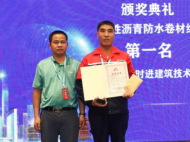 范春友大师,荣获高分子防水卷材组第3名,安徽防水协会颁发优秀防水工证书和奖金1000元,省防水协会轮值会长孙良民先生给范春友大师颁奖。