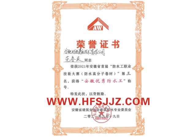 2021年安徽省首届优秀防水工,荣获安徽省首届“防水工职业技能大赛(防水高分子卷材)”第三名。