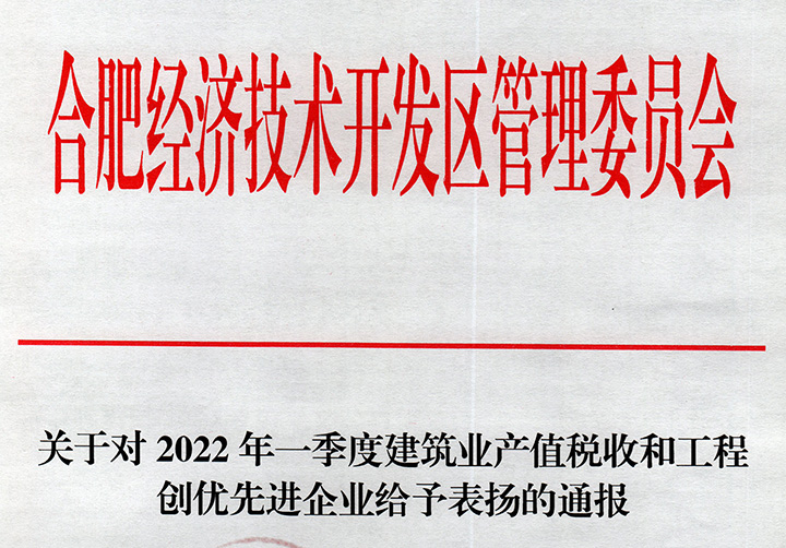 2022年5月18日,为表彰先进、树立典型,合肥经济技术开发区管理委员会对全区2022年一季度建筑业产值、税收靠前和工程创优工作表现突出的建筑业企业给予通报表扬。