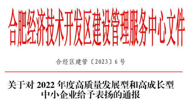 合肥时进建筑技术有限公司荣获合肥经开区建设管理服务中心“2022年度高质量发展型和高成长型中小企业表扬通报”。