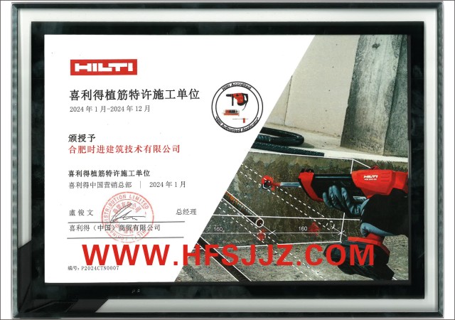 喜利得(中国)商务有限公司颁授予合肥时进建筑技术有限公司为“喜利得植筋特许施工单位”。